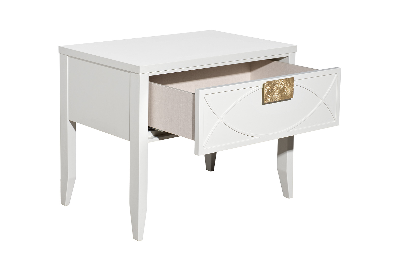 Дизайнерская тумбочка в стиле ар-деко - авторская разработка студии Garda Decor. Бежевый матовый фасад украшен объемным дугообразным декором и широкими рельефными ручками золотого цвета (матовое золото). Выдвижной ящик прекрасно подойдет для домашней аптечки, хранения белья, щеток, косметики и прочих мелочей. На просторной столешнице будет прекрасно выглядеть одна из настольных ламп в стилистике ар-деко, ассортимент которых широко представлен на нашем сайте. Тонкие ножки придают конструкции легкость и изящество. Эксклюзивная тумбочка станет гармоничным дополнением интерьера спальни, гостиной или прихожей. На фото на сайте тумба прикроватная с 1-м ящиком представлена в комплектации с двумя видами шкафов-витрин: арт.151SV-000017(шкаф-витрина открытый узкий), арт.151SV-000015(шкаф-витрина с 1-м стеклянным фасадом). Тумба прикроватная и витрины скрепляются между собой саморезами(в комплекте).