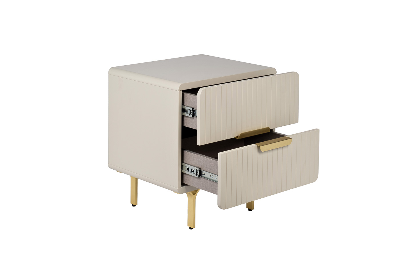 Тумбочка в светло-бежевом оттенке подходит для современных интерьеров и сможет гармонично вписаться в любое помещение за счет своих небольших размеров и аккуратной формы. Обтекаемые формы, тонкие ножки и минималистичные ручки на двух выдвижных ящиках делают изделие достойным представителем трендовой мебели. Качественный МДФ, из которого выполнен фасад изделия, обеспечивает долгую эксплуатацию. Благородства и стиля изделию придают металлические элементы в золотом оттенке.